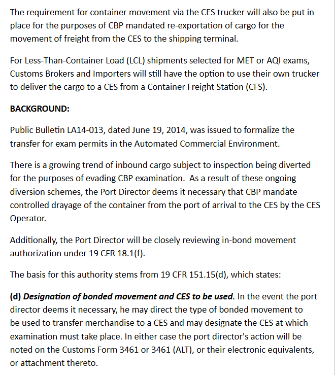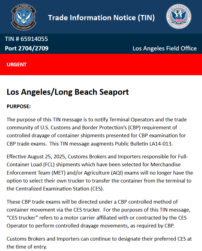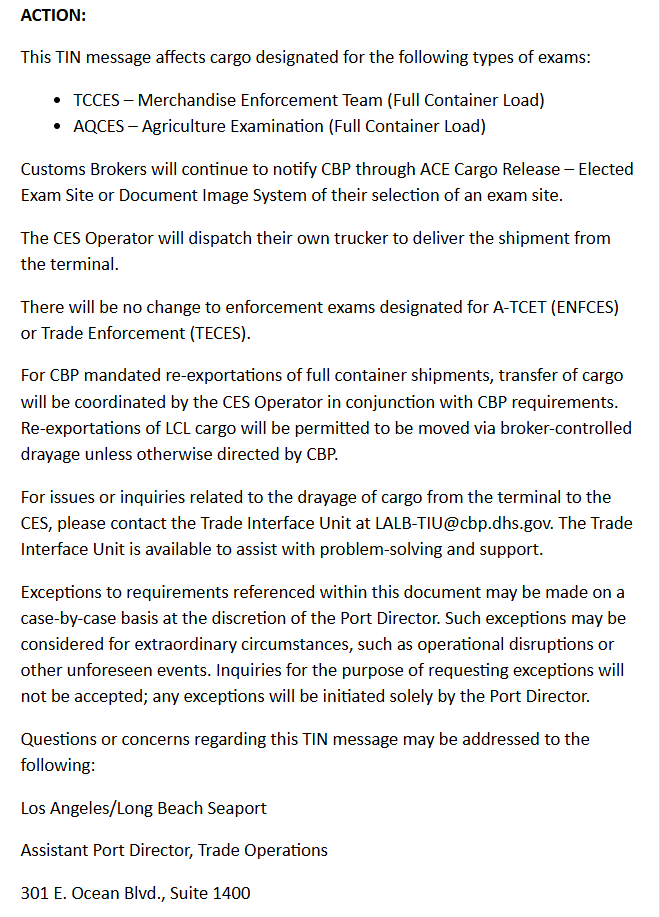 U.S. Customs and Border Protection, Los Angeles/Long Beach Seaport LALB sent this bulletin